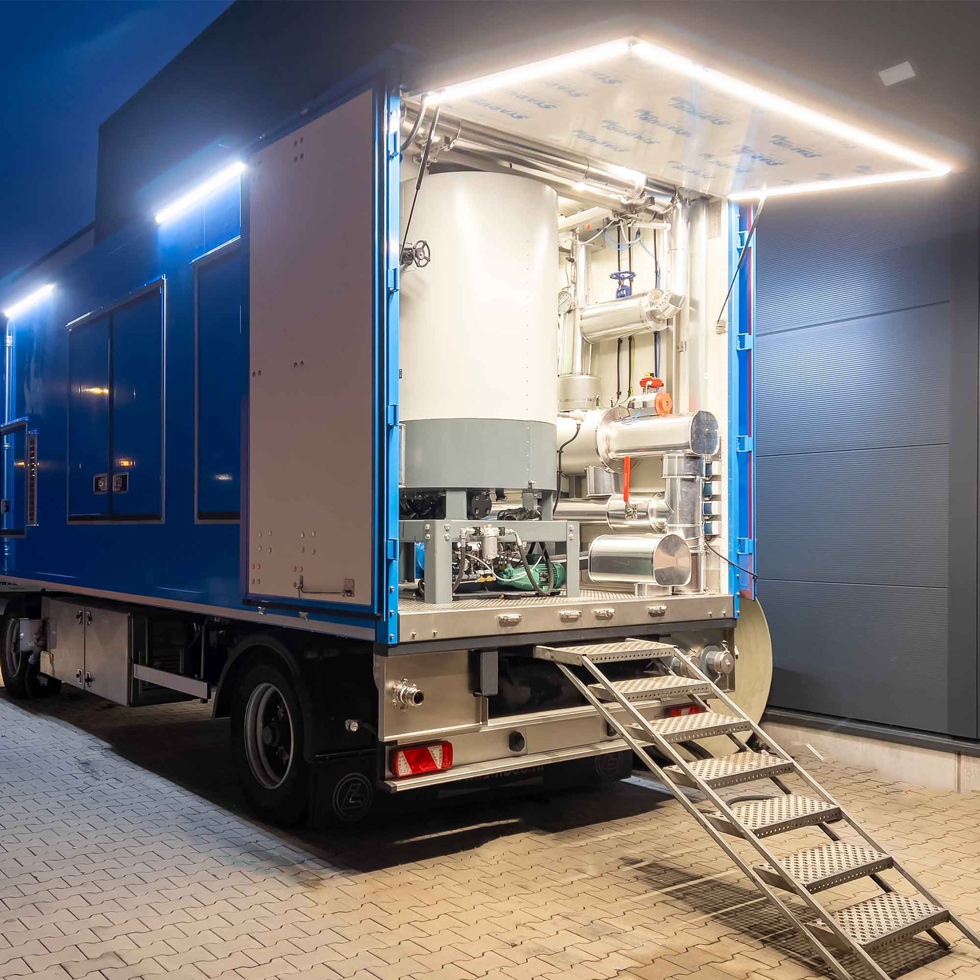 • Betrieb auf höchstem Niveau – Trailerbasiertes, einsatzbereites Design mit kurzen Rüstzeiten, großem 3.400 L (790 gal) Wassertank mit Enthärtungsanlage, 1.000 L (270 gal) Öltank, Vollisolierung, Edelstahlboden und integrierter LED-Beleuchtung.