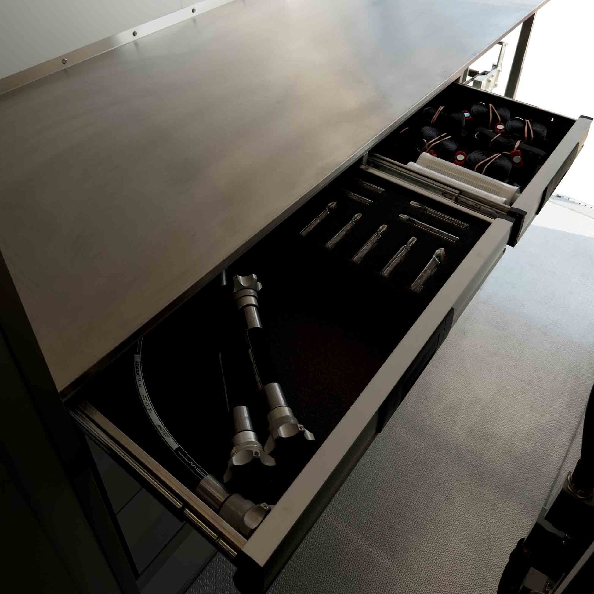 • Edelstahl-Werkbank mit Dreh-Schraubstock, 9 Schubladen, Wandschrank und großzügigem Stauraum für Zubehör.